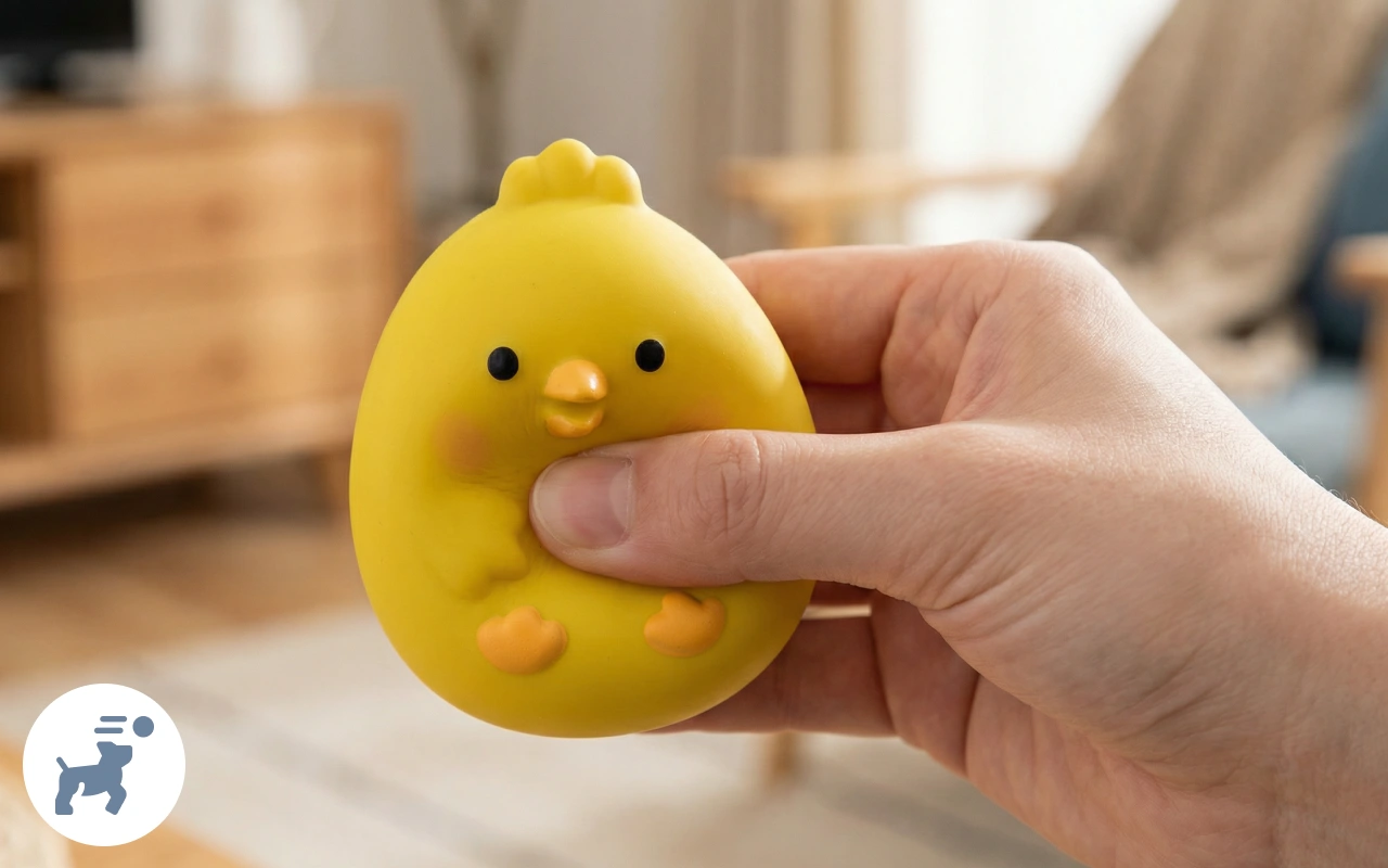 Abbiamo appena preso un cucciolo e il giocattolo a forma di pollo lo tiene occupato. Lo squittio cattura la sua attenzione ed è abbastanza flessibile da poterlo portare in giro.