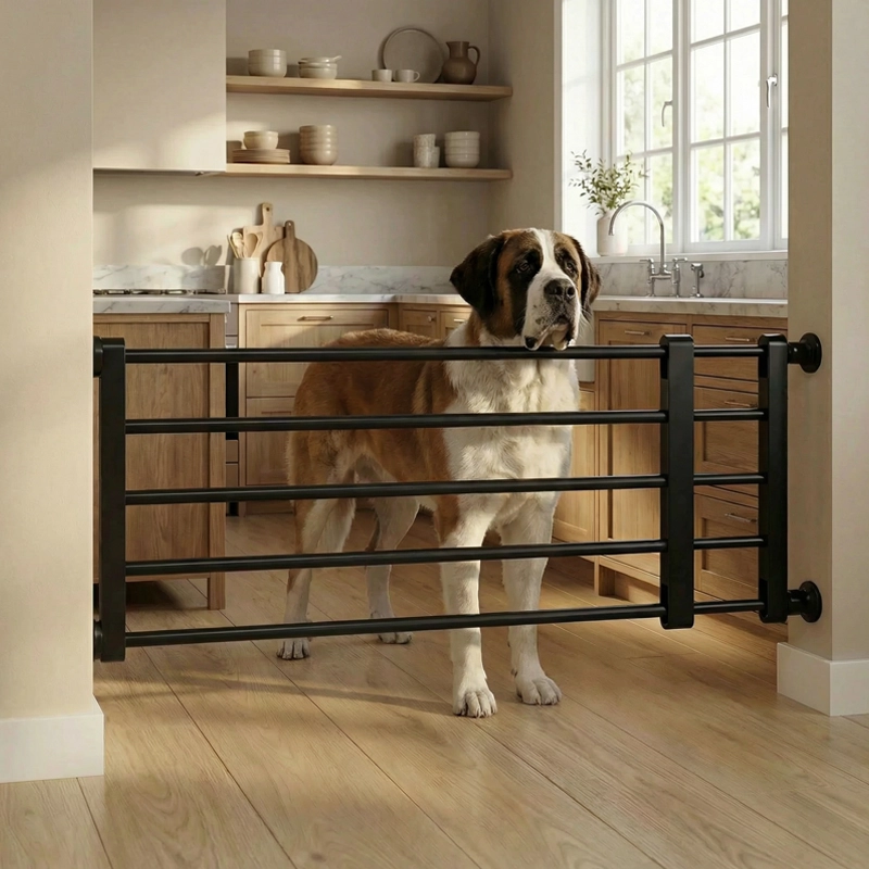 Il nostro cucciolo non si intrufola più in cucina! Ho installato velocemente questo cancello di metallo ed è resistente anche quando ci salta sopra.