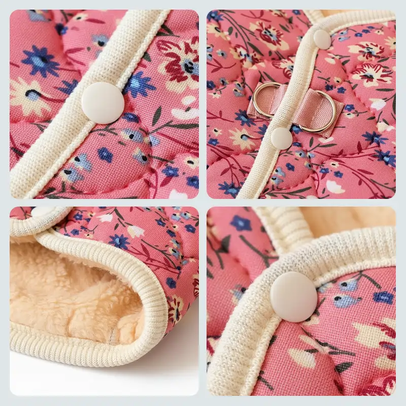Primdog porta comfort nei giorni freddi grazie a un design studiato. La morbida fodera in pile aiuta i cuccioli a sentirsi subito al caldo all'aperto. Ogni giacchino ha pratici bottoni per una vestizione semplice. Deliziose fantasie floreali aggiungono fascino ad ogni uscita.