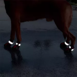 Questi stivaletti per cani sono perfetti per le passeggiate serali. Le loro strisce riflettenti renderanno il tuo amico peloso visibile in condizioni di scarsa luminosità.