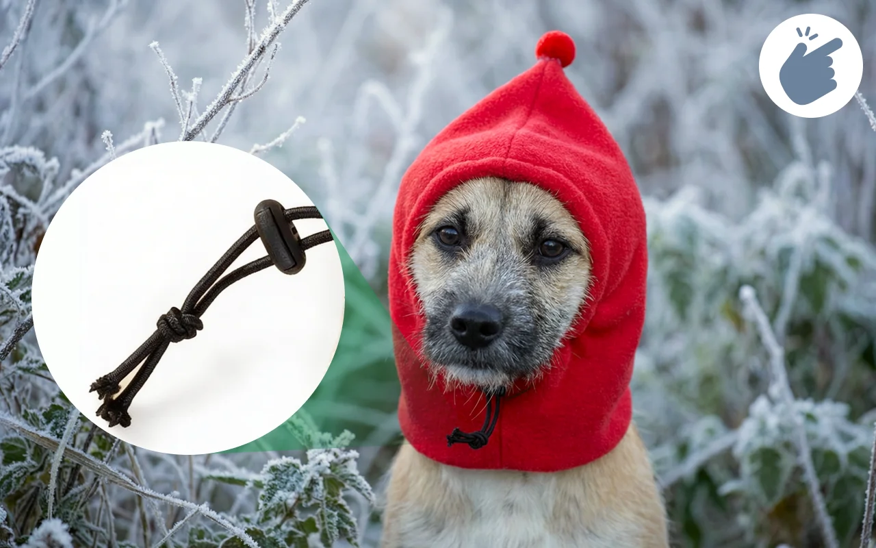 Amo assolutamente il design con il laccetto! Tiene il cappello ben fermo e al mio cane non dispiace affatto indossarlo. Il pile è super morbido.